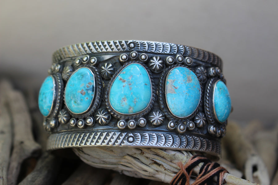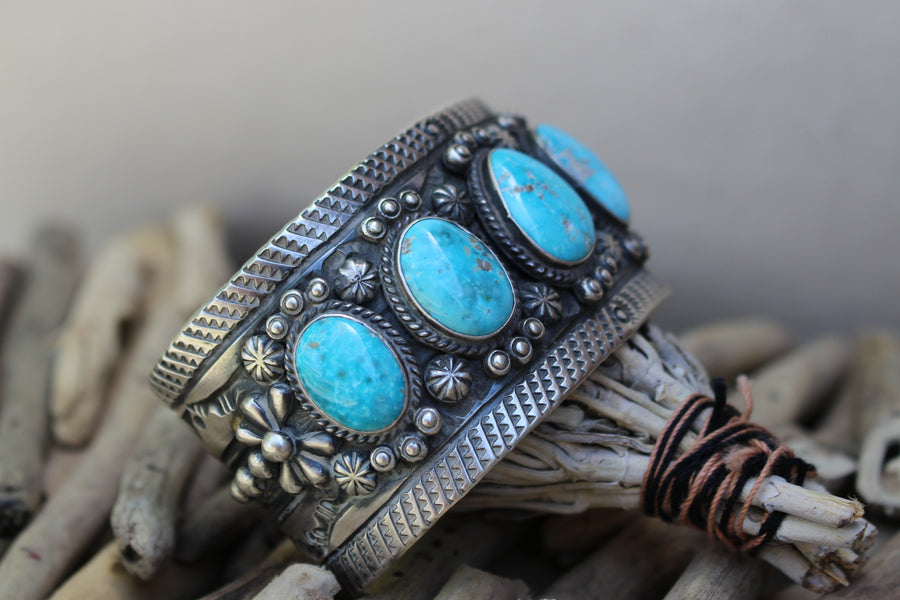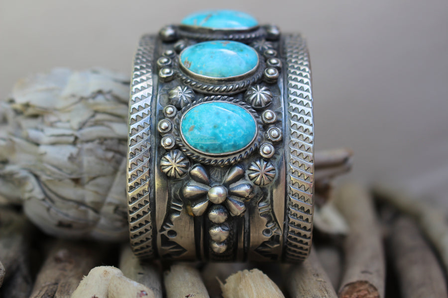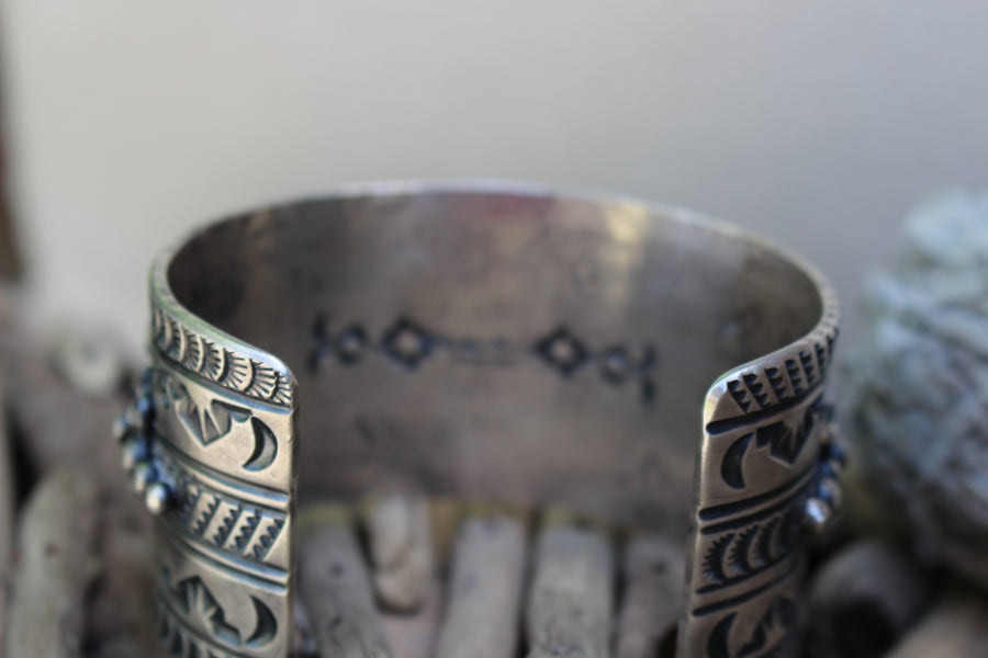 The Turquoise Stone Bracelet is a stunning piece made of genuine sterling silver featuring a turquoise stones with natural matrix. This bracelet boasts of expert craftsmanship and a timeless design. Stamped with artisans hallmark and 'sterling' for authenticity. Elevate your style with this timeless piece.
