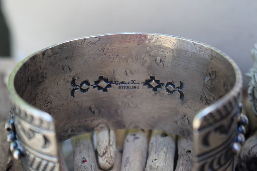 This bracelet measures 7.25 inches (inside circumference) with a gap of 1.25 inches.