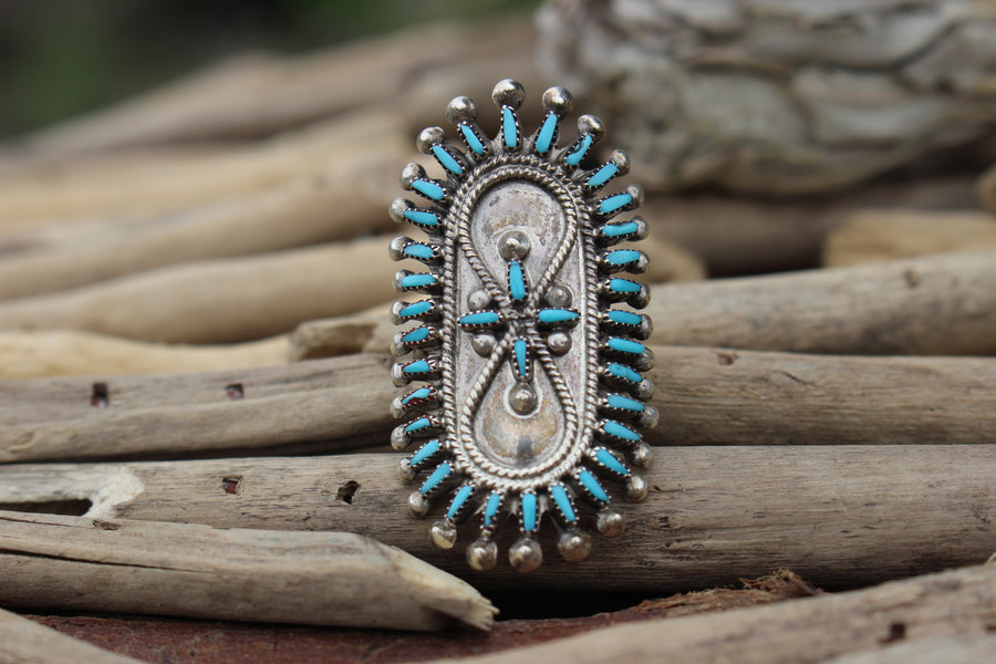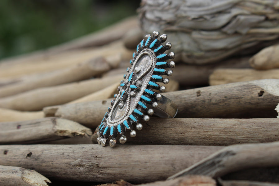 Handcrafted by Native artisan, the Turquoise Star Ring features petit point turquoise with natural matrix cut and set in sterling silver. Elevate your look with this stunning piece of jewelry.
