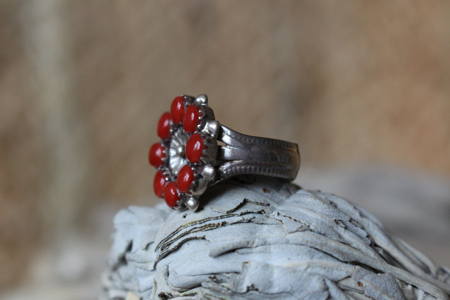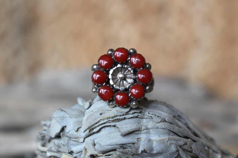 This ring handmade by artisan, E. Wyaco hallmarked and stamped 'sterling' features coral cut and set in sterling silver. The perfect touch of coral to compliment your favorite style of outfit!