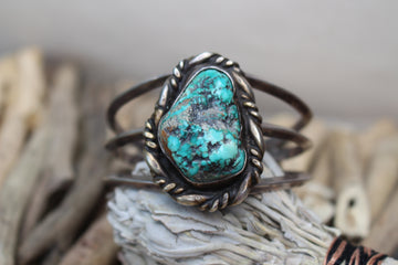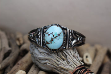 This stunning bracelet crafted by a Navajo artisan hallmarked 'M&R' and stamped '.925' features turquoise with natural matrix cut and set in sterling silver. A statement bracelet to complete your favorite look!