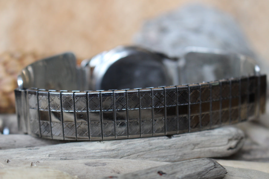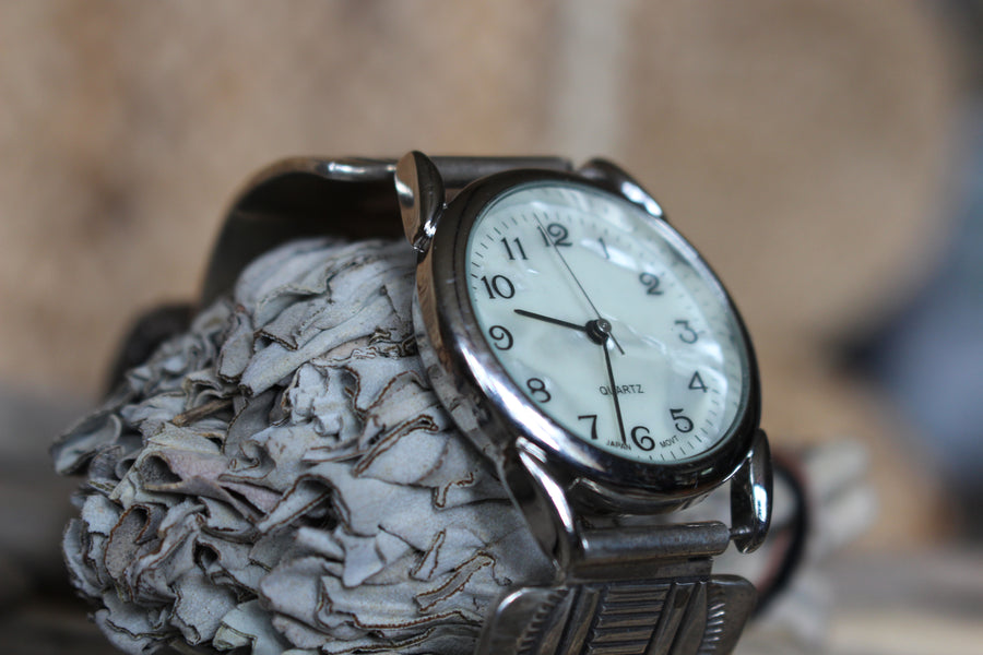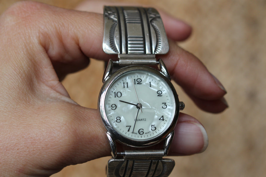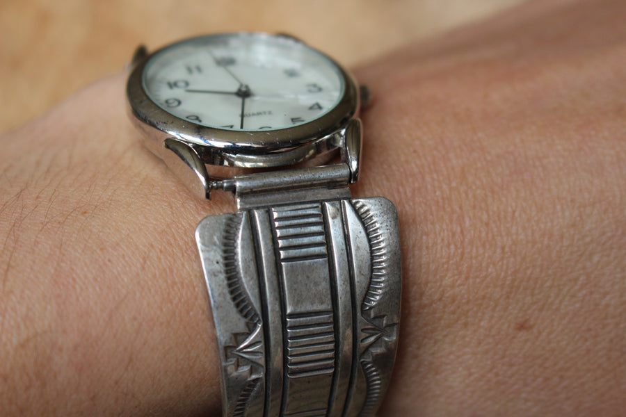 This stunning Sterling Watch features sterling silver with a hand-stamped detailing and a stretchy band for comfortable wear. The quartz watch face adds a touch of elegance, while the inside circumference of 7.5 inches ensures a comfortable fit. Elevate your style with this timeless piece.